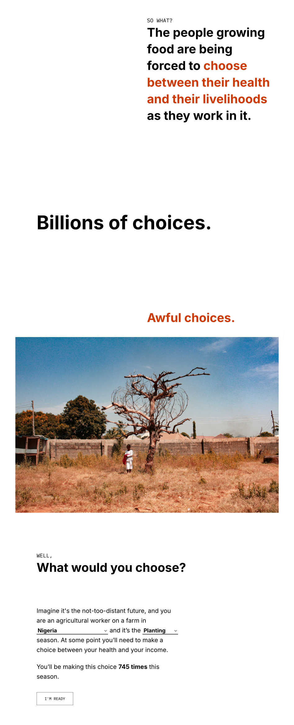 Inspired by our work on agricultural adaptation in Africa and a desire to experiment with Observable’s new Framework tool, we set out to create a project that goes beyond traditional data analysis, but to build empathy.
