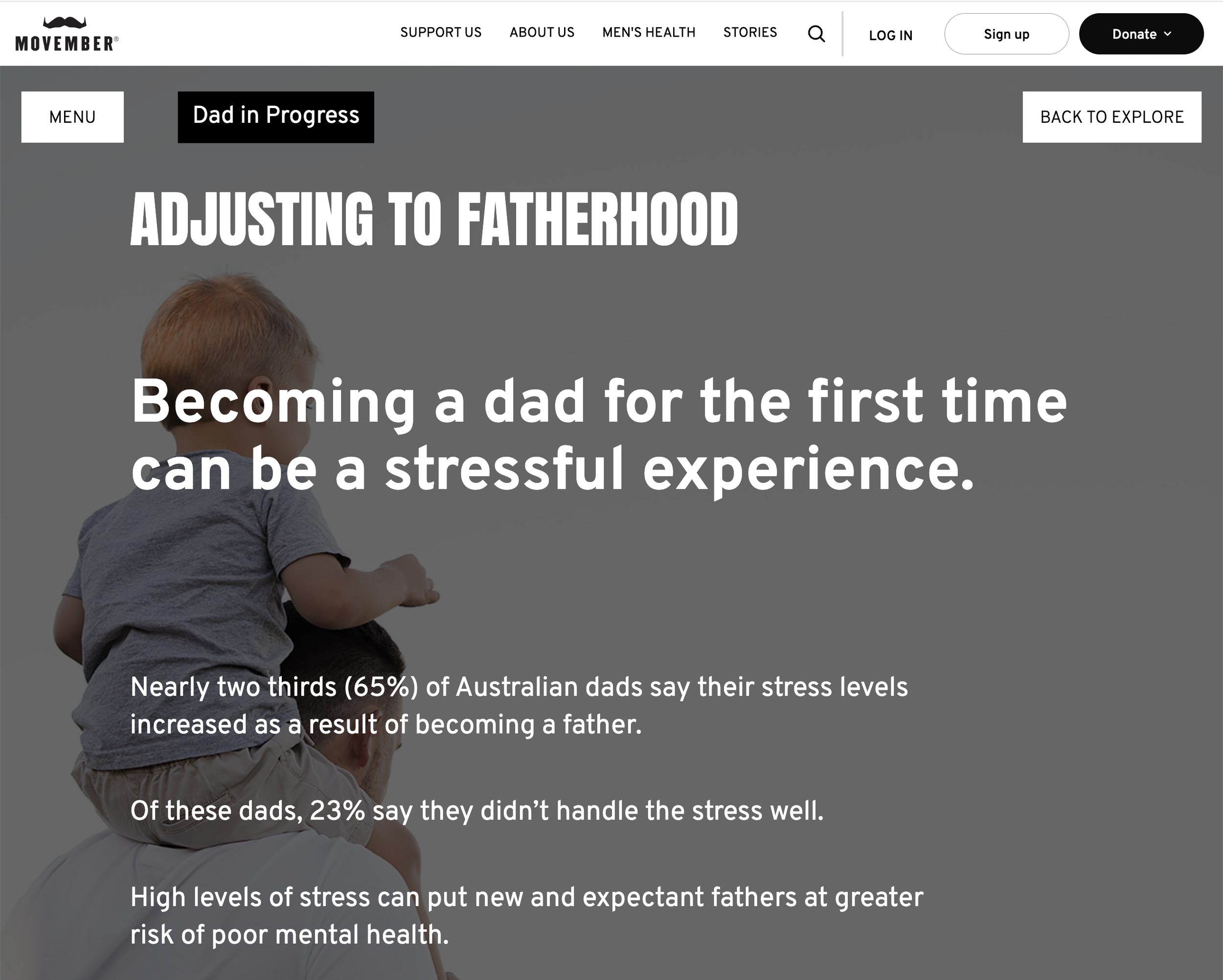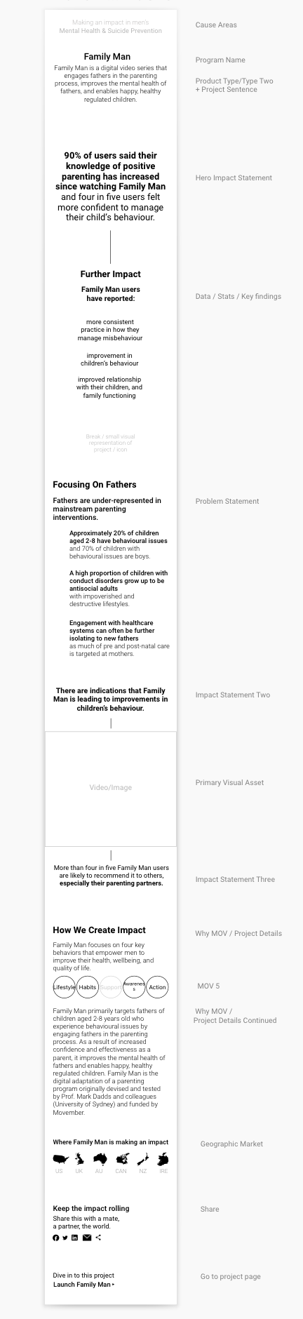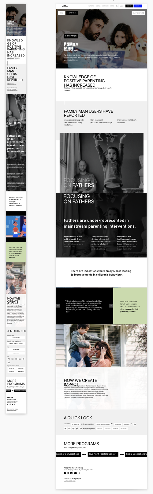 Movember's projects span different types, scales, and cause areas, all aimed at supporting men's health. Each project page needed to provide a high-level view of how each project aligned with broader efforts like cause areas or healthy behaviors. Additionally, pages had to include specific details such as problem statements, impact statements, statistics, and testimonials, while also incorporating rich media, a key part of Movember's identity.